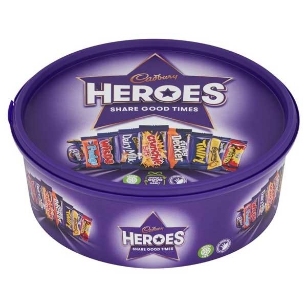 Det her er den perfekte made at sige ”Tak!” på. Den her gigantiske chokoladeæske er perfekt at dele og er fyldt med alle dine favoritter fra Cadbury Heroes. En blanding af små miniatureudgaver af Cadbury-favoritterne i en chokoladeæske, der er lige til at dele. Heroes-fans elsker at rode rundt og lede i æsken for at finde dem, de bedst kan lide. Her finder du både Cadbury Dairy Milk, Cadbury Dairy Milk Caramel, Eclairs, Fudge, Twirl, Creme Egg Twisted, Crunchie Bits, Dinky Decker og Wispa.