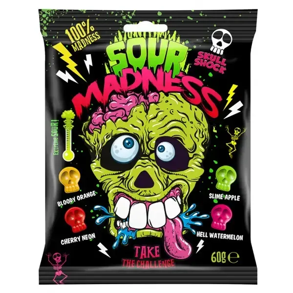 Zutaten: Glukosesirup, Zucker, Säureregulatoren (Zitronensäure, Äpfelsäure), Aromen, Pflanzenkonzentrate (Spirulina, Saflor), Farbstoffe (E100, E160c, E163), Überzugsmittel (Akaziengummi, Carnaubawachs).